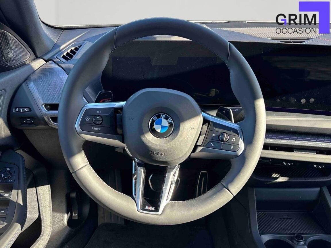 • Volant M gainé cuir Trois branches. Jante en cuir noir 'Walknappa', inserts chrome perlé et repose-pouce dans le volant. Logo M sur la base du volant.Palettes de changement de rapport avec fonction BOOST.