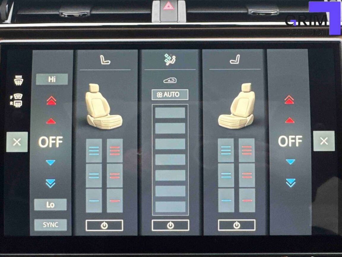 • Sièges AV réglables électriquement en 20x20 directions AV (longueur, inclinaison du dossier, hauteur inclinaison de l'assise, maintien latéral, extension d'assise, supports lombaires x4, hauteur des appuie-têtes, appuie-tête enveloppants manuels) , mémorisation du siège conducteur, banquette AR inclinable électriquement et accoudoir central AR